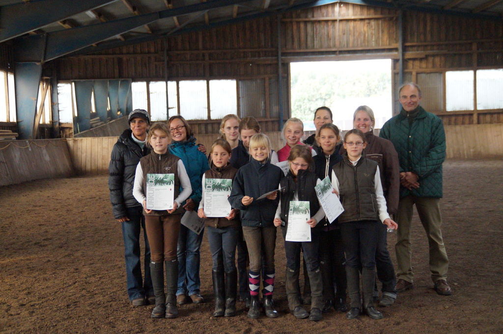 In den Herbstferien stand wieder lernen, lernen ,lernen aber auch viel Spaß haben auf dem Programm. 5 Tage wurden die Prüflinge vorbereitet und starteten dann gut gelaunt in die Prüfung. Richter Herr Seemann lobte das hohe Niveau der Reiter und so können wir gratulieren: