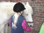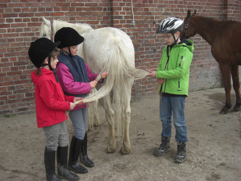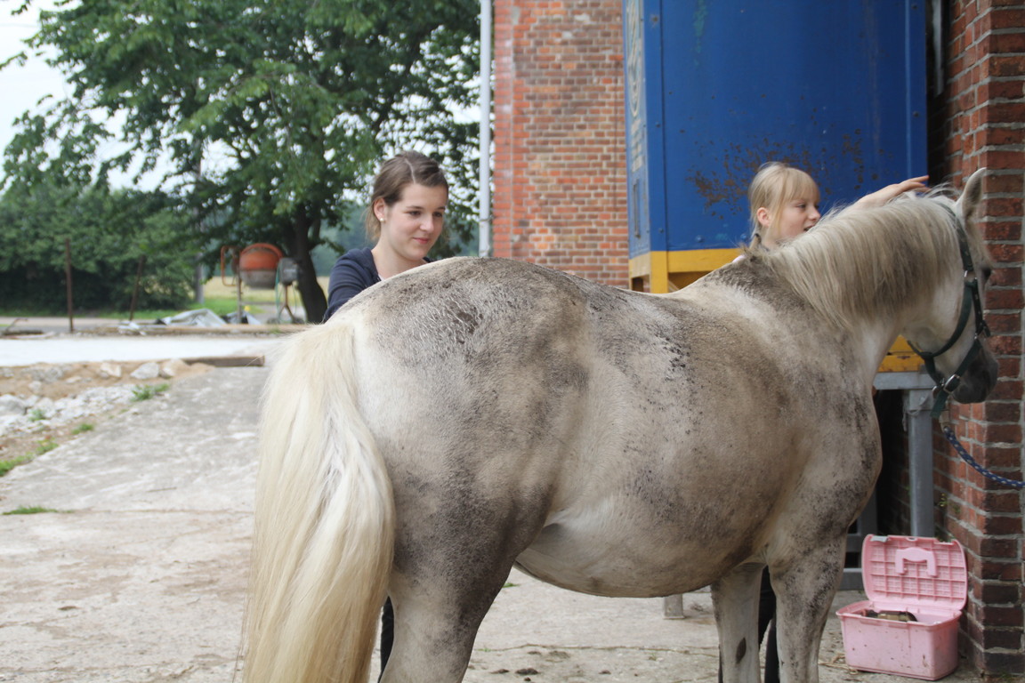 Nach einer großen Runde um Krumbecks Felder haben Ponys und Reiter sich gestärkt und sich dann nochmal vermehrt der Pfedepflege gewidmet. Schweife waschen und verlesen, Mähnen bürsten und sogar Hufe waschen und fetten.